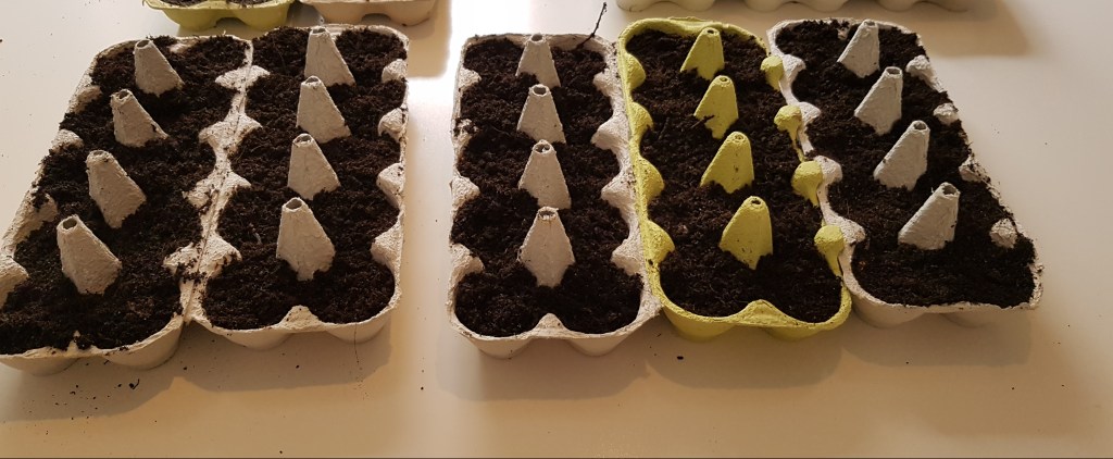 Ich möchte für die Anzucht möglichst wenig Dinge kaufen, weswegen ich meine Samen in Eierschachten vorziehe. Pro Eierfach kommen dafür 2-3 Samen in die Erde.