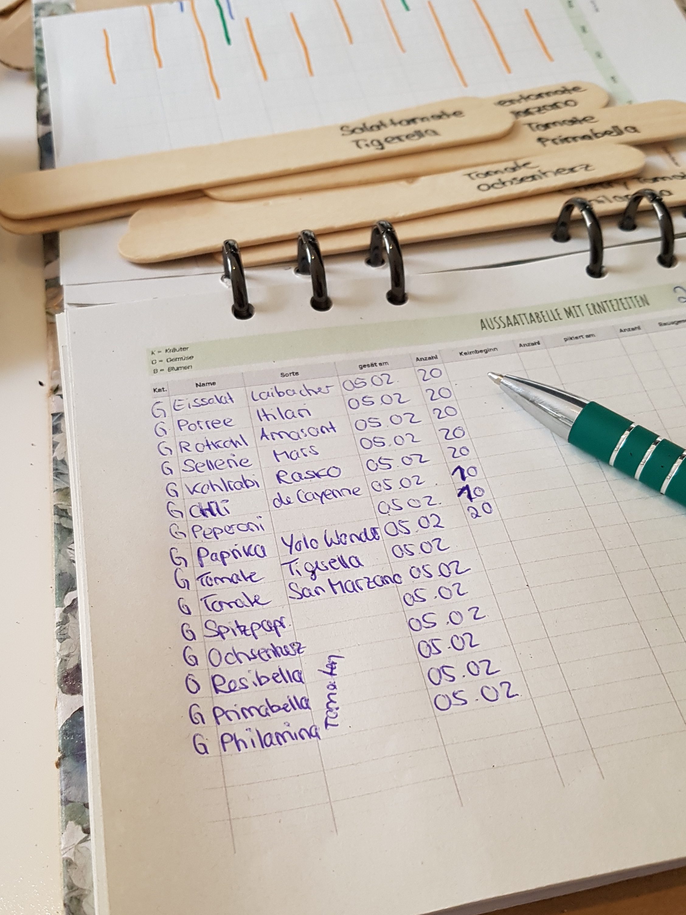 Letztes Jahr hatte ich nur eine Sorte Tomaten und eine Sorte Paprika vorgezogen, das war wesentlich einfacher als mehrere unterschiedlichen Arten und Sorten auszusäen. Ich habe mir den Winter über ein Gartenplaner erstellt, in dem ich auf einem Blick sehen kann, was ich wann säen, pflanzen, pflegen und ernten sollte. Außerdem hab ich eine Aussaattabelle erstellt. So habe ich einen guten Überblick, wie die unterschiedlichen Sorten gekeimt sind und kann zum Ende des Jahres besser ein Feedback ziehen.