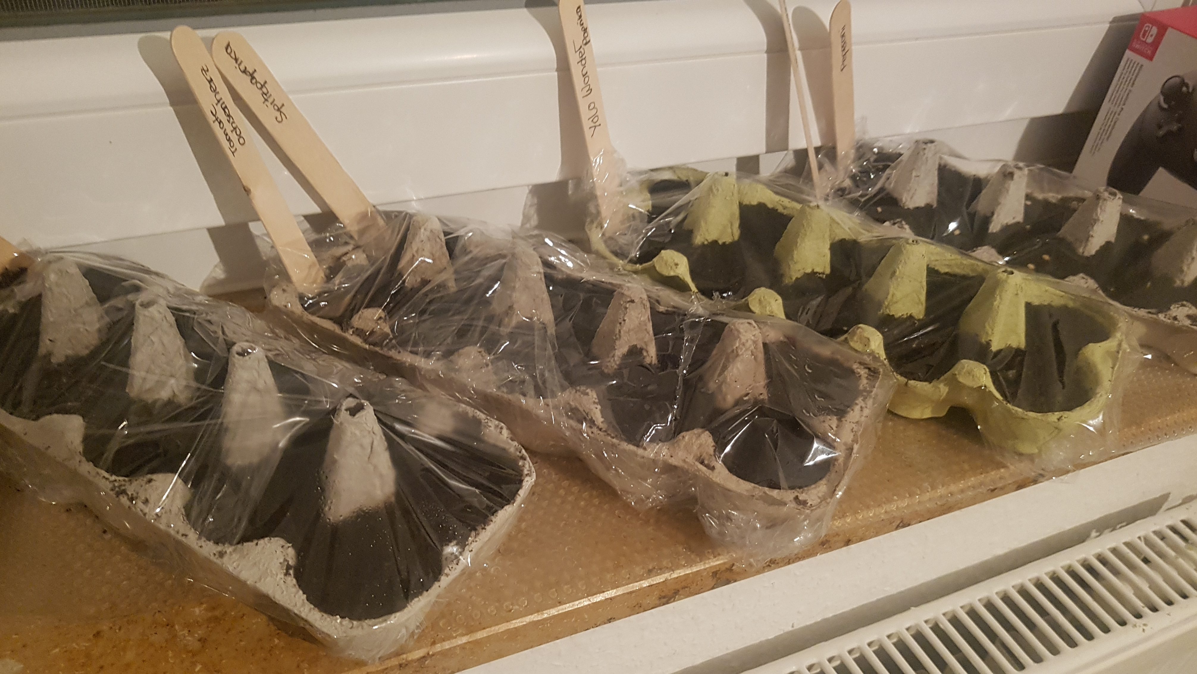 Bei Pflanzen, die es feucht-warm bevorzugen (wie Tomaten und Paprika), wickle ich die Eierschachteln bis zur Keimung in Frischhaltefolie ein. Nach ein paar Stunden sieht man schön, wie sich Wassertropfen an der Folie bilden. Wichtig ist, dass man hier täglich 5-10 Minuten lüftet, also die Folie entfernt, damit sich kein Schimmel bildet. Wenn die Keimlinge da sind, wird keine Folie mehr benötigt.