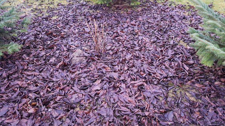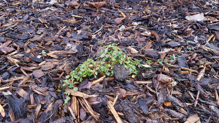 Im Sommer letzten Jahres legte ich also Pappe auf den Bereich, auf dem ich lieber Rindenmulch haben wollte. In die Pappe kamen Löcher, um die Pflanzen in die Erde zu setzen. Darauf kam der Rindenmulch. Die ersten Tage hatte ich die Pappe noch mit Steinen erschwert, damit sie nicht wegfliegt oder verrutscht. Nach dem ersten Regen konnte ich die Steine wegnehmen. Die zusätzliche Schicht erhöhte das Beet etwas, aber ich hoffte, dass das mit der Zeit wieder etwas absackt.