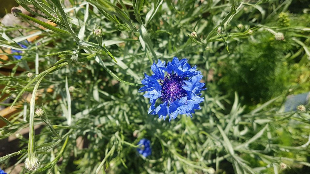 Als ich im letzten Jahr, 2021, in meinem neuen Gartenstückchen, die Kornblumen auf der Wildblumenwiese mit aussäte, kamen Blüten in verschiedensten Farben. Da fiel mir auf: die ganze Pflanze ist eigenartig und wunderschön, aber erst dieses typische Blau macht sie für mich zur schönsten Blume überhaupt. Sie ist wild und echt, wagt es, ihm Kornfeld zu stören, ist aber weder giftig noch böse. Im Gegenteil: die Kornblume ist essbar und heilsam.