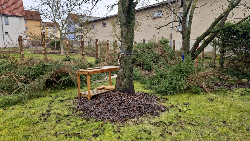 Die Stämme werden weiterverwendet für neue Beete. Plötzlich wirkt der zukünftige Schattengarten viel zu hell. Das fehlende Laub der Bäume sorgt dafür, dass jede Menge Licht durch die Bäume kommt. Doch das wird sich bald ändern.