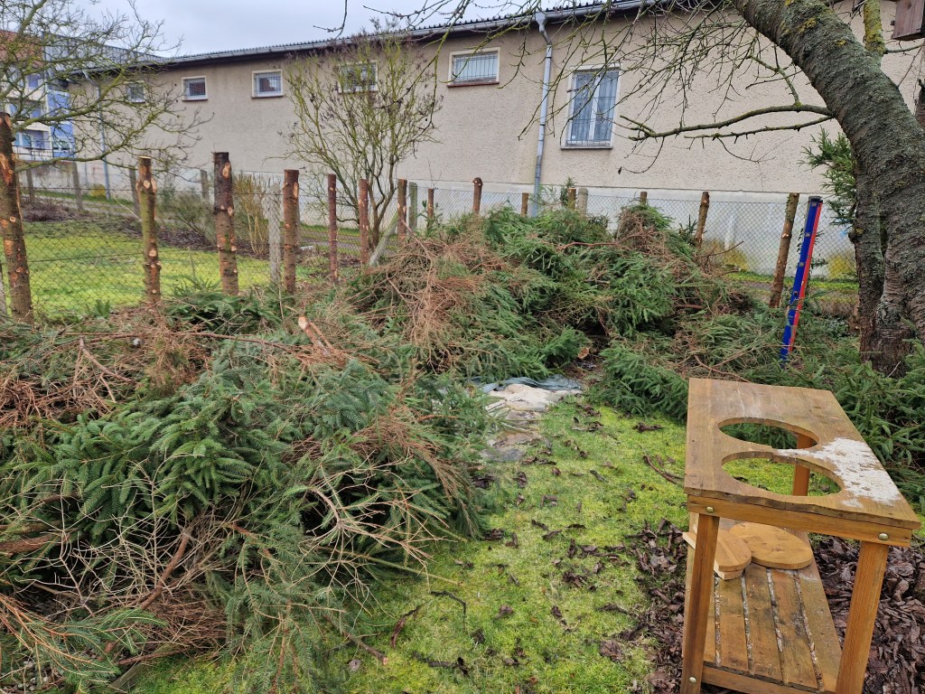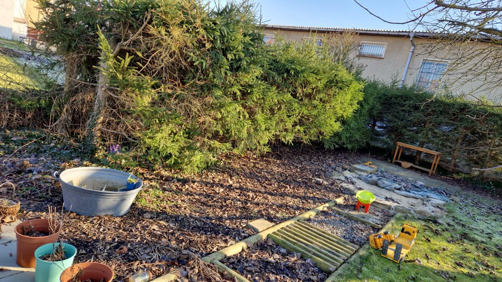 Die halbtote Hecke war nicht sonderlich ansehnlich. Sie musste weg. So haben wir bereits im Februar die Hecke weggenommen und sind die Tage dabei, den Grünschnitt zu entsorgen.