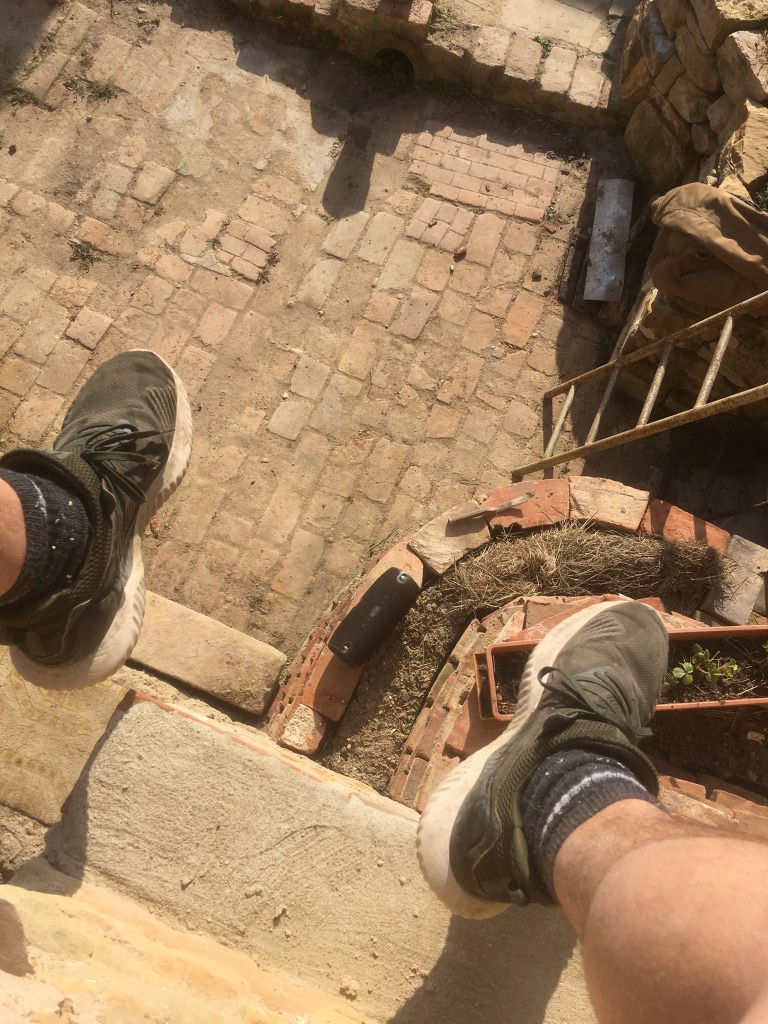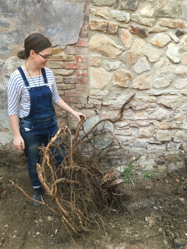 Apropro Boden, Das war so eine Sache für sich, denn wir fanden keinen! Darum einigten wir uns irgendwann auf ein Höhenniveau, weil wir dachten, dass der Boden vielleicht einfach nicht mehr da bzw. fest war. Und etwa eine Woche später, beim Ausgraben einer weiteren hartnäckigen Hollunderwurzel, entdeckten wir ihn noch gute 20cm unter unserem ausgemachten Niveau.