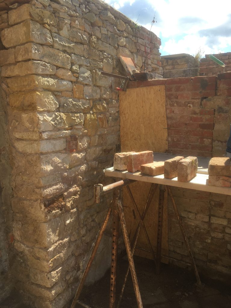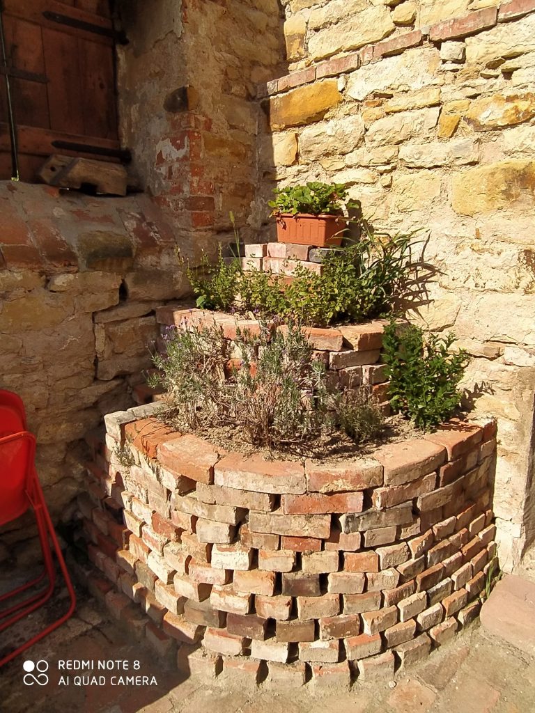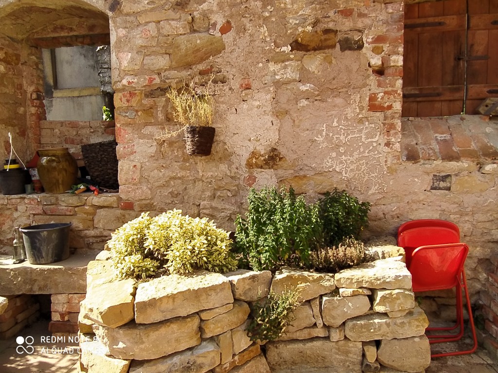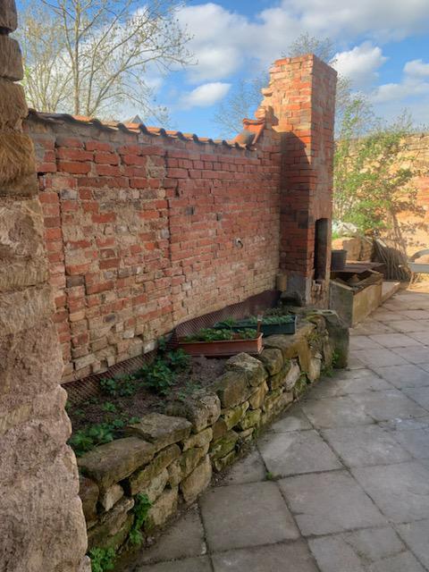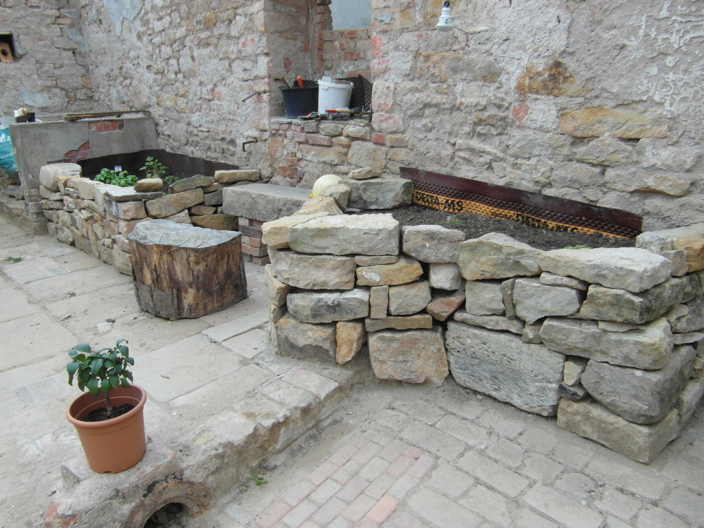 So nach und nach bekamen wie die ersten Bereiche frei. Was für ein Wahnsinns-Gefühl, gerade mit dem schönen Steinboden, den wir entdeckt haben! Es wurde mittlerweile Frühling und wir wollten Garten-Erfolge sehen. Also fanden wir raus, wie man Hochbeete aus Trockenmauern baut. Steine waren ja im Übermaß vorhanden und wir wollten (und mussten) so wenig Geld wie möglich ausgeben. Der erste Einkauf waren also 2 Säcke Mörtel, um die untere Steinschicht zu befestigen. Der Rest war Präzisionsarbeit. Die Steine mussten gut ineinandergreifen, die schöne Seite nach vorne und alles ein wenig nach innen stapeln, damit es später nicht von der Erde rausgedrückt wird. Und die Steine waren schwer! So sehr es mich ärgert, das zu sagen, aber das war Männerarbeit, da konnte ich nicht mithalten. Die weibliche Physiologie ist eben doch eine andere. Also nutzte ich die Zeit und buddelte in den anderen Ecken weiter, die noch unter Erde begraben lagen. Es war übrignes wirklich viel Erde! Irgendwann fragte mein kleiner Bruder ganz berechtigt, wo denn eigentlich die ganze viele Erde herkam, hat die etwa jemand hier mit Schubkarren hergebracht?