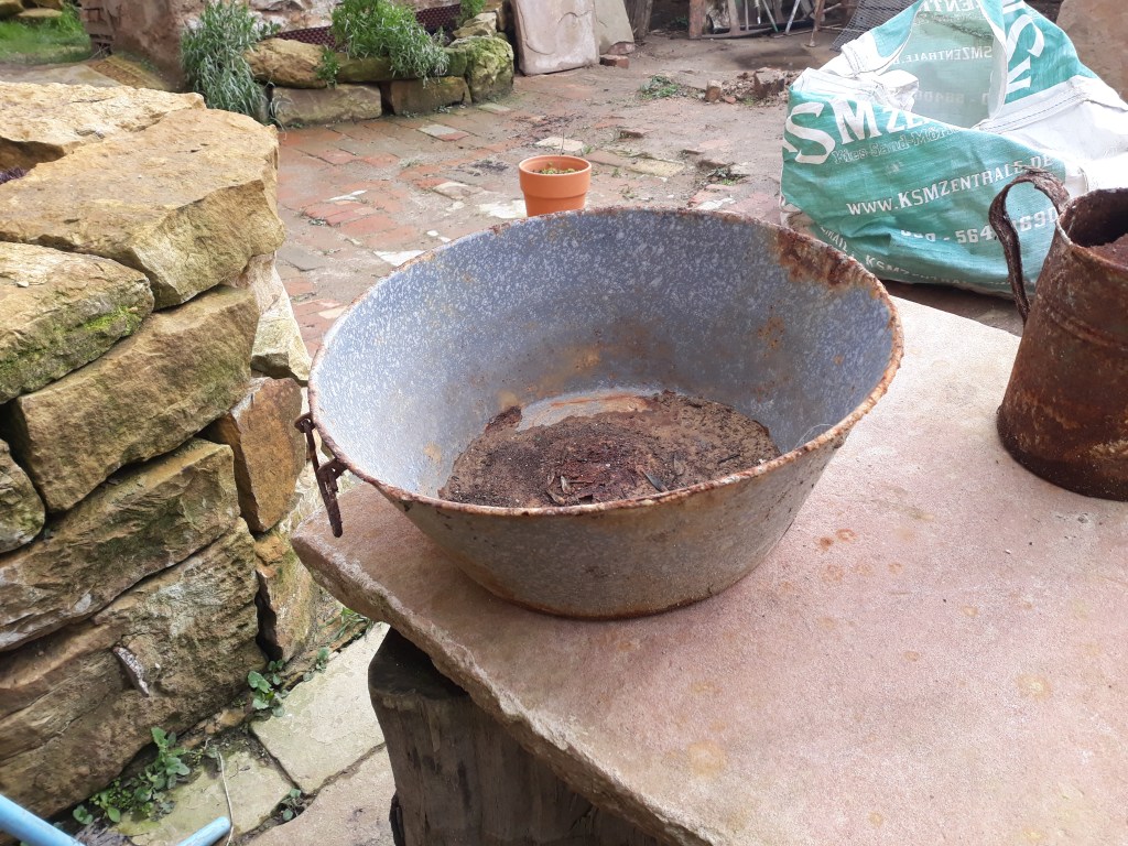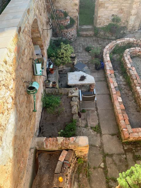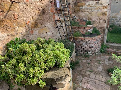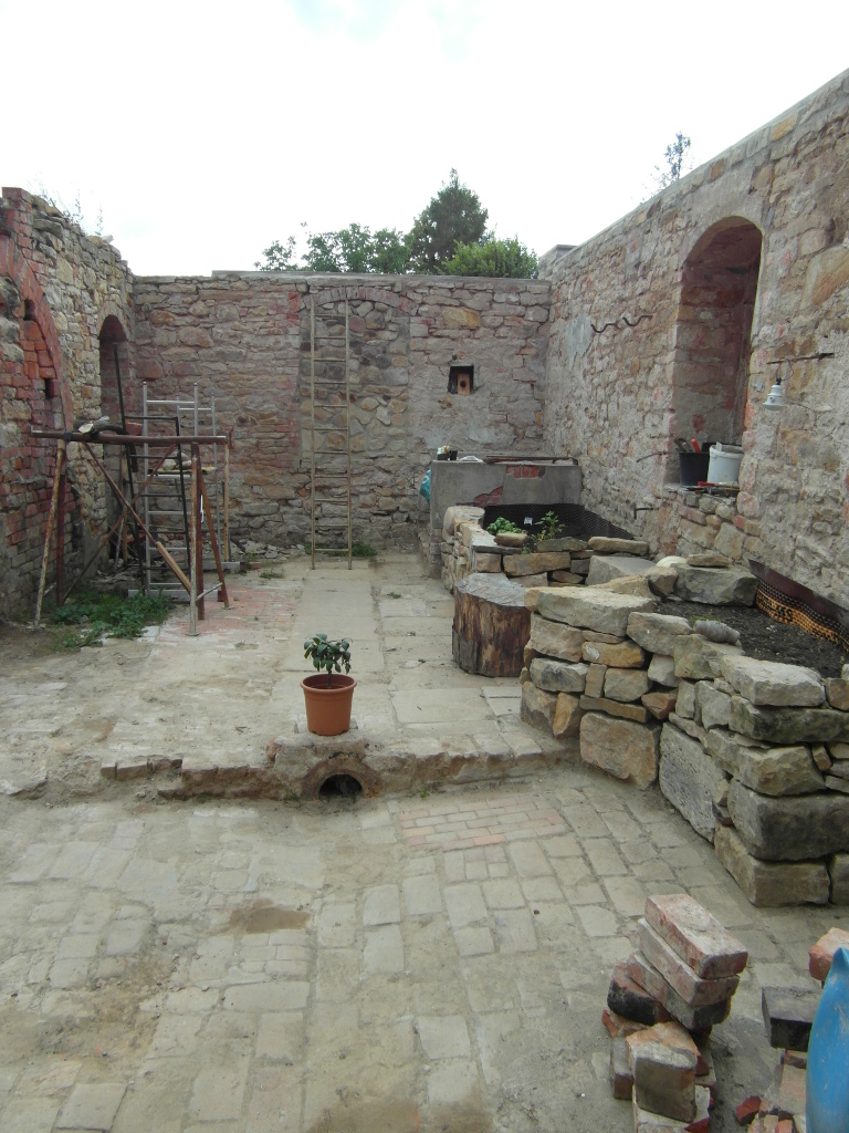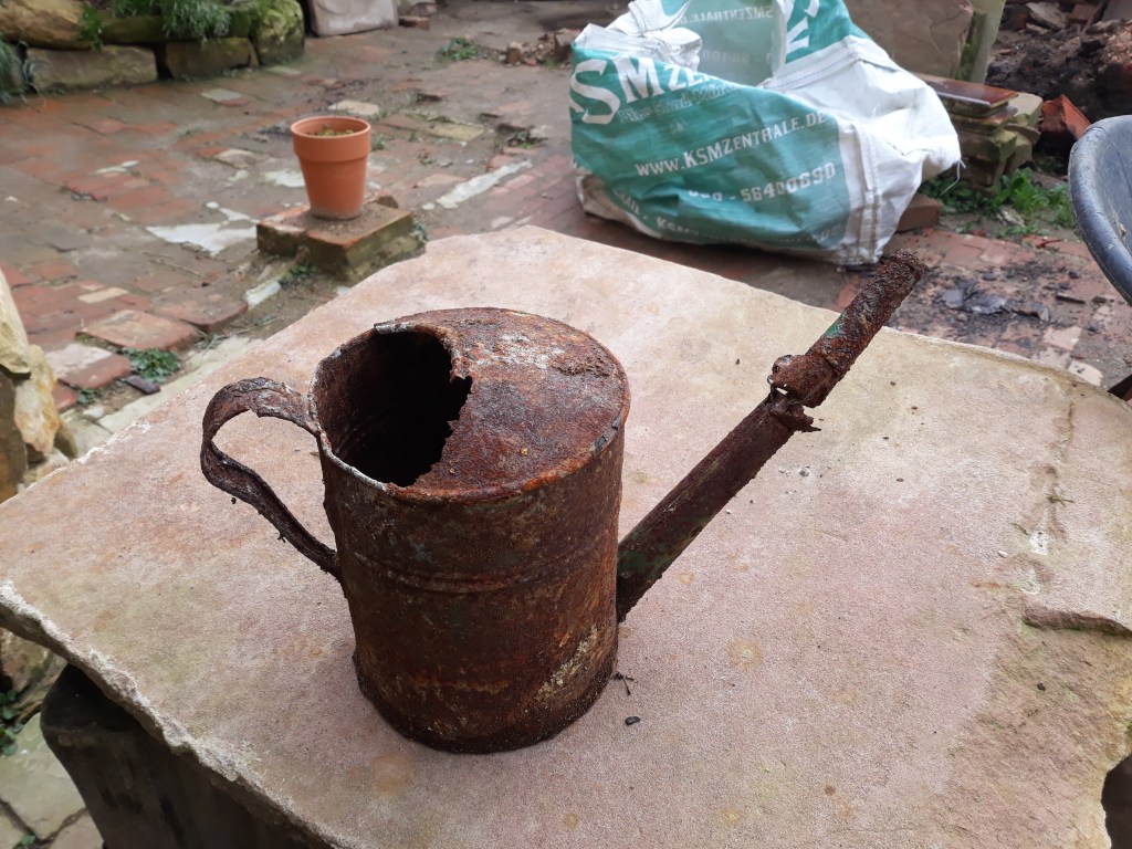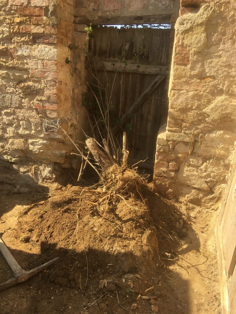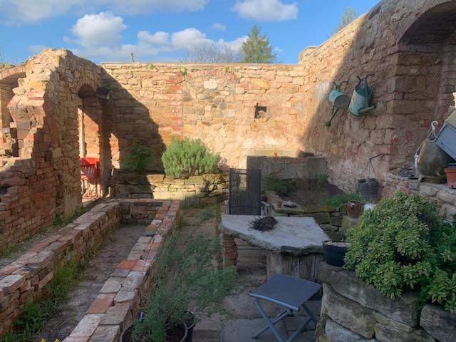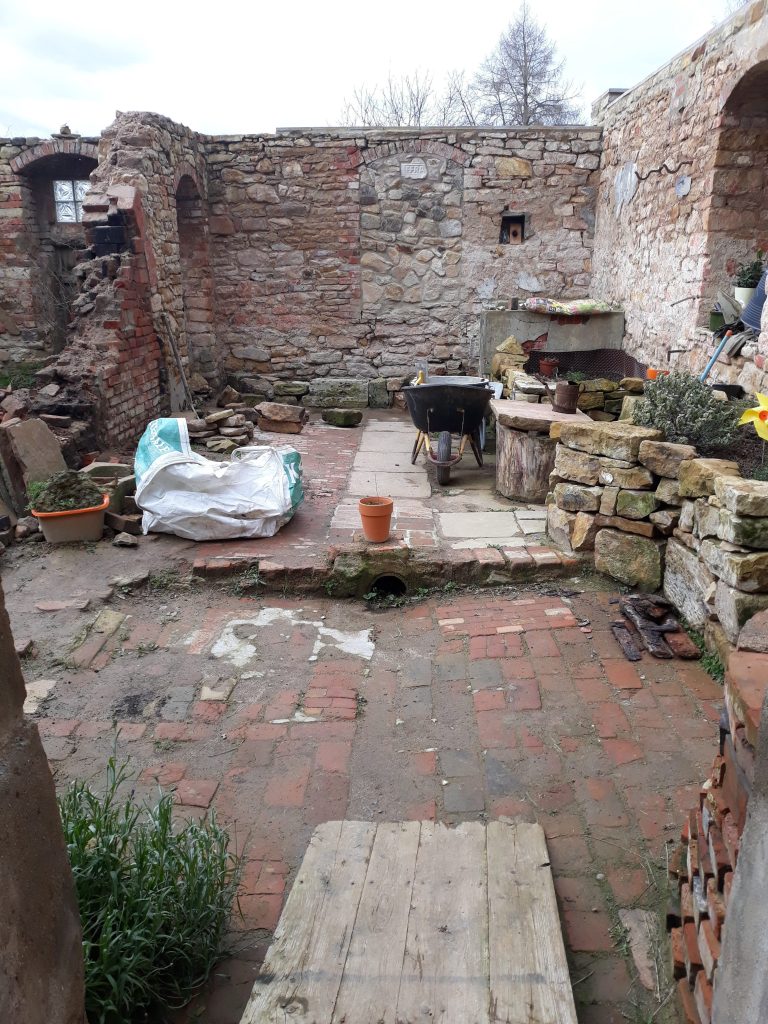 Naja, so nach und nach. Wir haben die ersten beiden Räume, unser erstes Ziel also, so gut wie fertig (auch wenn es „fertig“ im Garten ja eigentlich nicht gibt, nicht wahr?). Aber diese Ruine hat noch 4 weitere Räume, von denen 2 schon begonnen wurden freizubuddeln und die anderen beiden wirklich große Projekte sind, weil dort z.T. große Sträucher wachsen oder es sehr abschüssig nach unten geht. Von Altlasten wie altem Öl in rostzerfressenen Behältern und in Erde eingegraben mal ganz zu schweigen.
