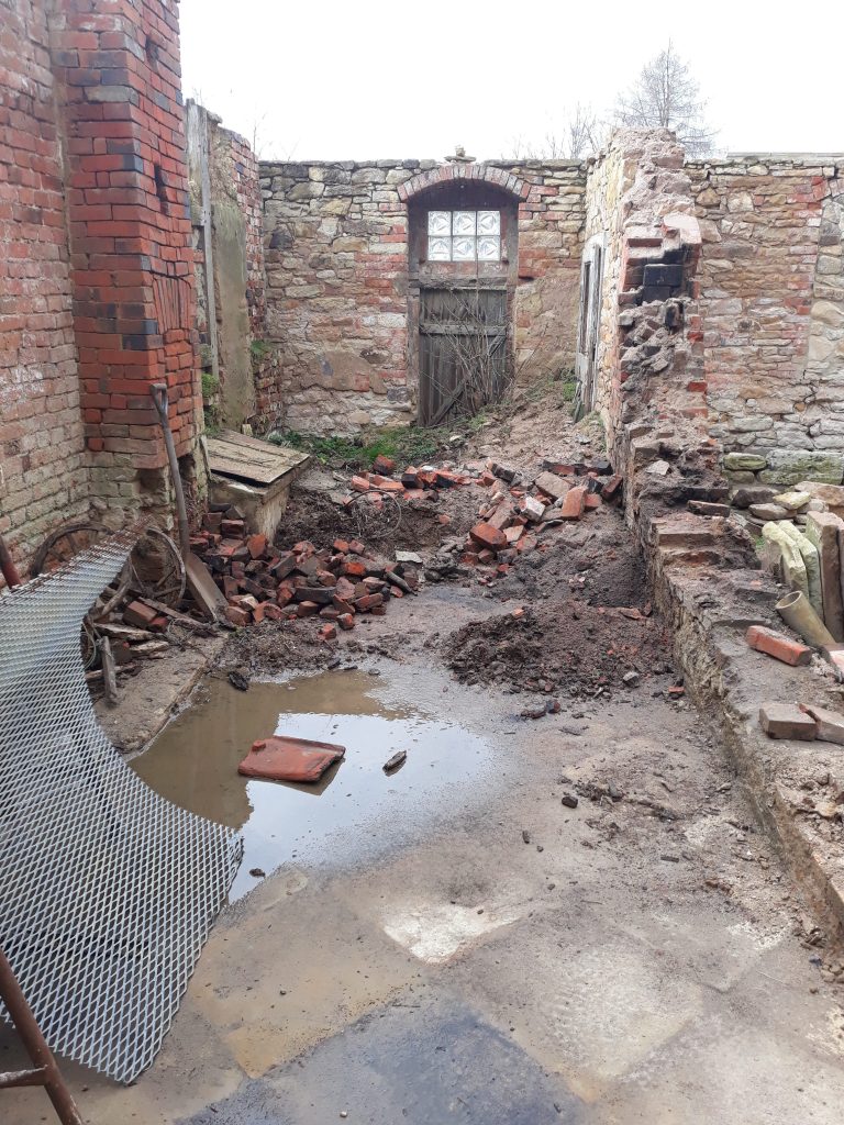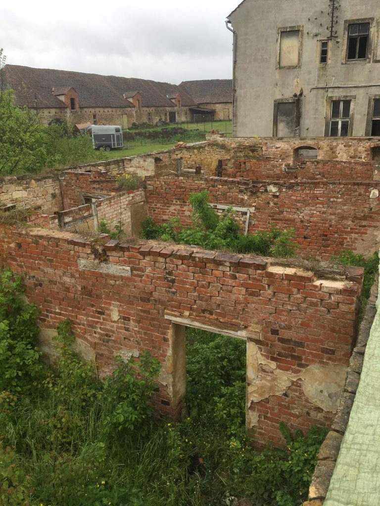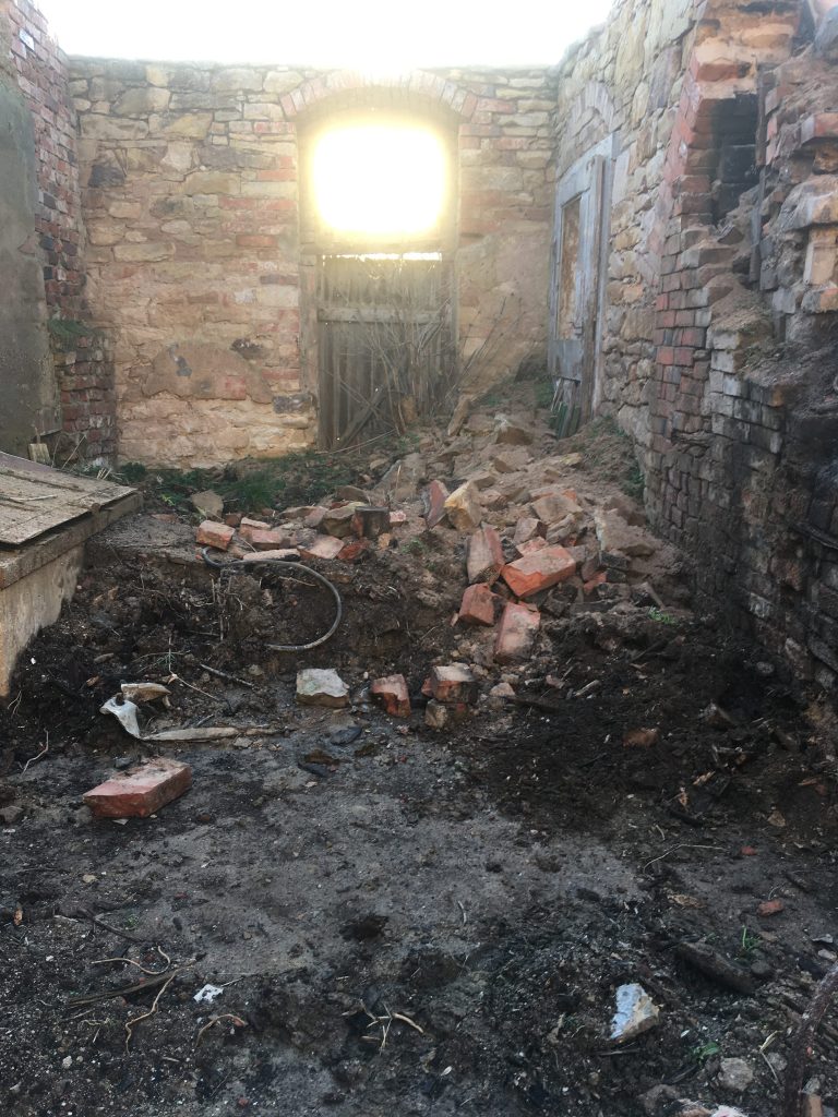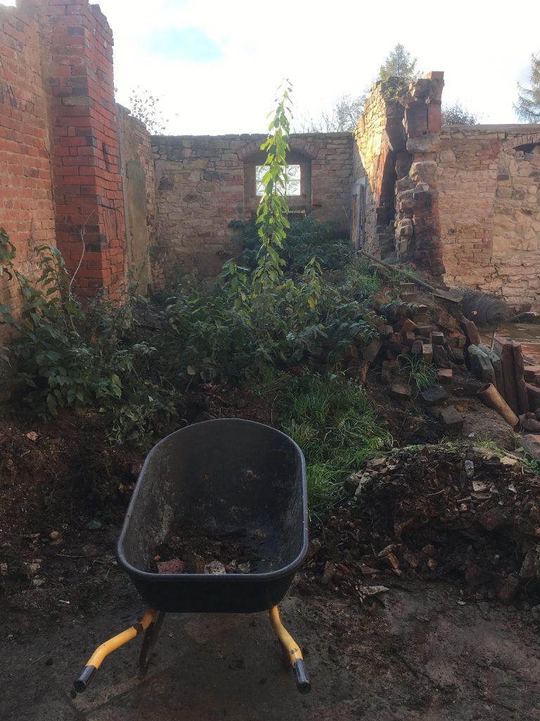 Das Haus stand seit 16 Jahren ohne Dach da, Seitdem hat sich dort allerhand angesiedelt an Dreck, Erde, Unkraut und Pionierpflanzen. Alle Steine und viele Restbalken sind dort unter diesen Dreckbergen. Niemand hat sich dafür noch interessiert. Am Anfang wurden bestimmt noch einige Balken oder brauchbare Ziegel rausgeholt, aber das ist lange her. Die Idee war also wirklich – verzeiht mir den Ausdruck – ein wenig irre. Alle anderen Freunde hatten höchstens ein Lachen übrig, was ihm da in den Sinn kam.