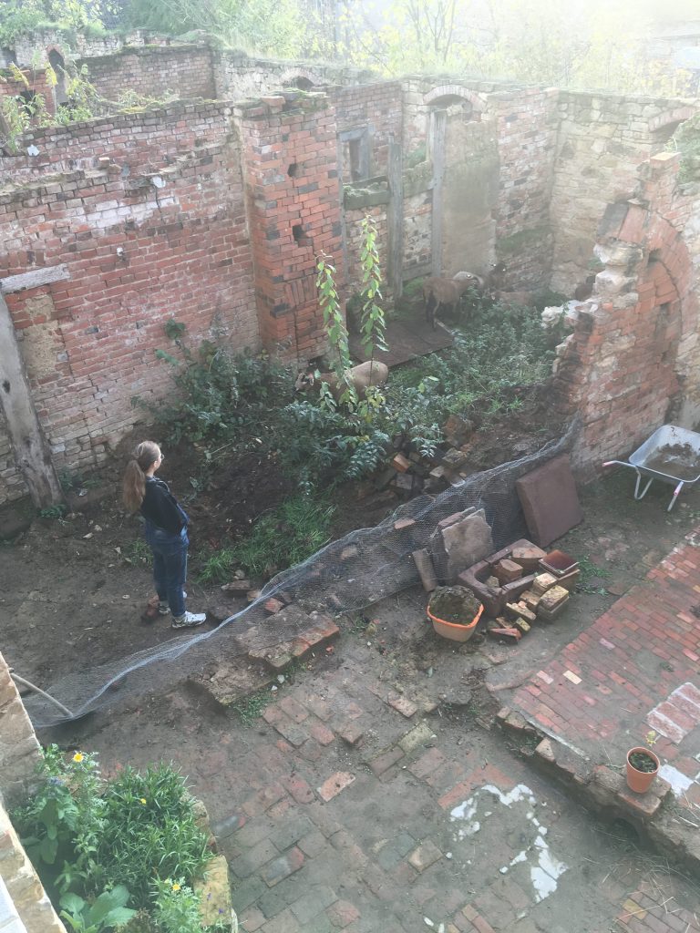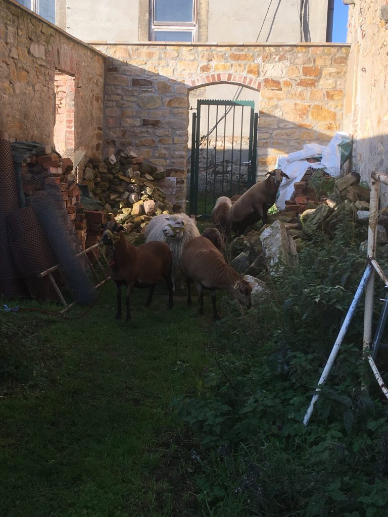 Bis wir im zweiten Jahr nach der Wintermüdigkeit weiter machten, war das Unkraut im nächsten Raum schneller als wir. Darum holten wir uns tierische Hilfe von den Ziegen, die Meister darin sind, solche Brachflächen kurz und kahl zu schlagen:
