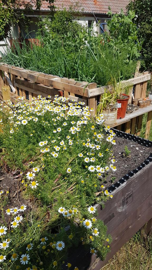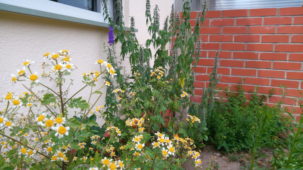 Auch hier zuhaus blüht mein Heilkräuterbeet mit Mutterkraut als bittere Hilfe bei Migräne, mit Herzgespann für Herzbeschwerden und mit der Ringelblume als Alrounder für die Haut. Wie schön das ist!